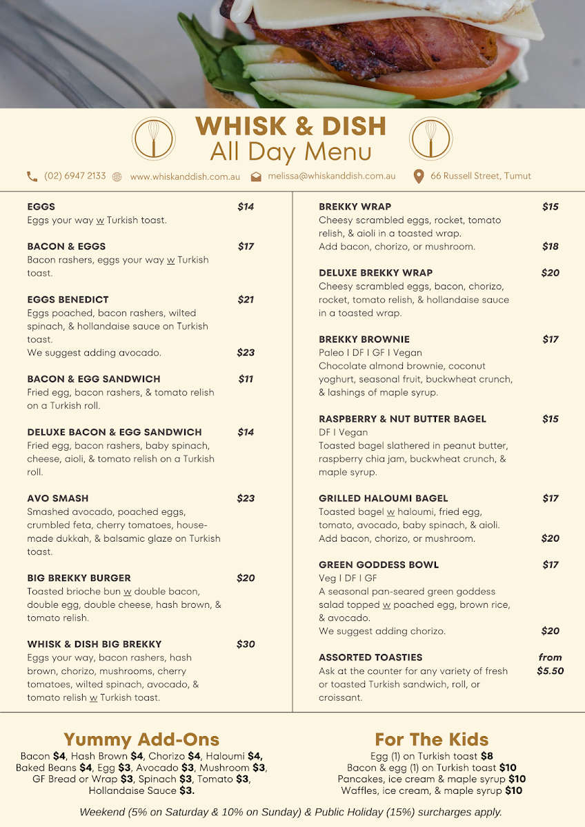 Welcome to Whisk and Dish, a delightful café located in the heart of Tumut at 66 Russell St. Perfectly blending charm and comfort, this café stands out as the go-to spot for breakfast and brunch. The menu features enticing options for both adults and kids, ranging from a classic Bacon & Egg on Turkish toast to indulgent Pancakes with ice cream and maple syrup, all priced at a delightful A$10.00.